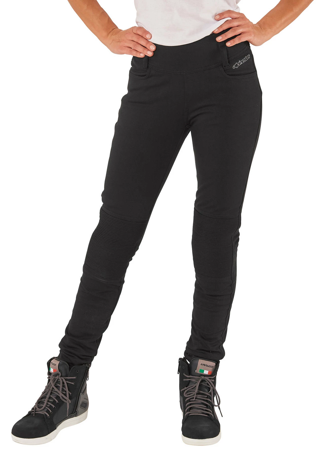 Is there such a thing as really snug-fitting motorcycle trousers for female bikers? Yes, of course there is! Just look at the Alpinestars “Banshee” Lady Motorcycle Leggings. Wonderfully close-fitting and figure-hugging, and made of very elastic stretch fabric. These leggings are such a great fit, you’ll look stylish both on and off your motorbike. That’s because *Banshee* leggings are genuine motorcycle trousers, complete with protectors, abrasion-resistant fabric and everything else you’d expect.