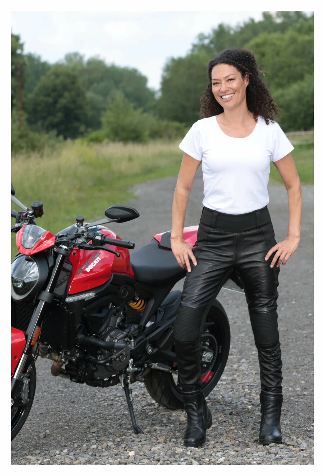 Leggings as leather biker trousers? Great idea! Because there’s nothing to beat the look of slim-fit leather trousers. That’s what Büse thought, so now they’ve launched their cowhide *Bella* ladies’ leggings (textile fabric on the back of the leg, 92% polyamide, 8% elastane). These figure-hugging motorcycle trousers are also really comfortable. *Bella* leggings are great-looking …