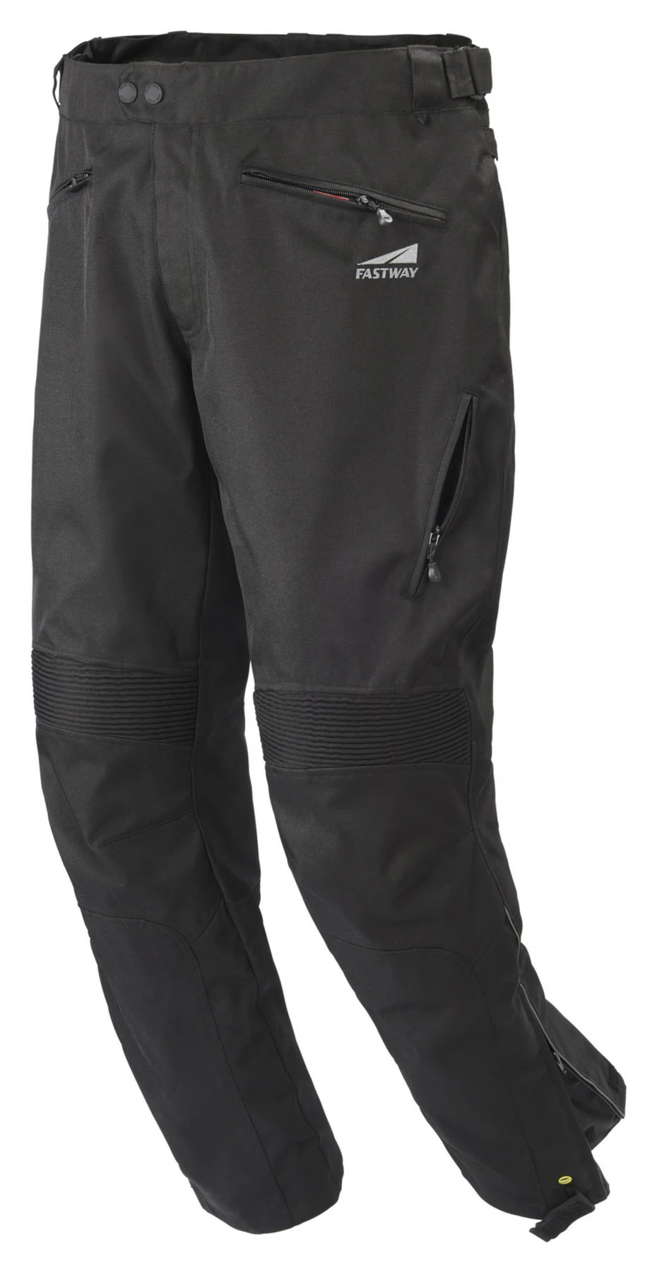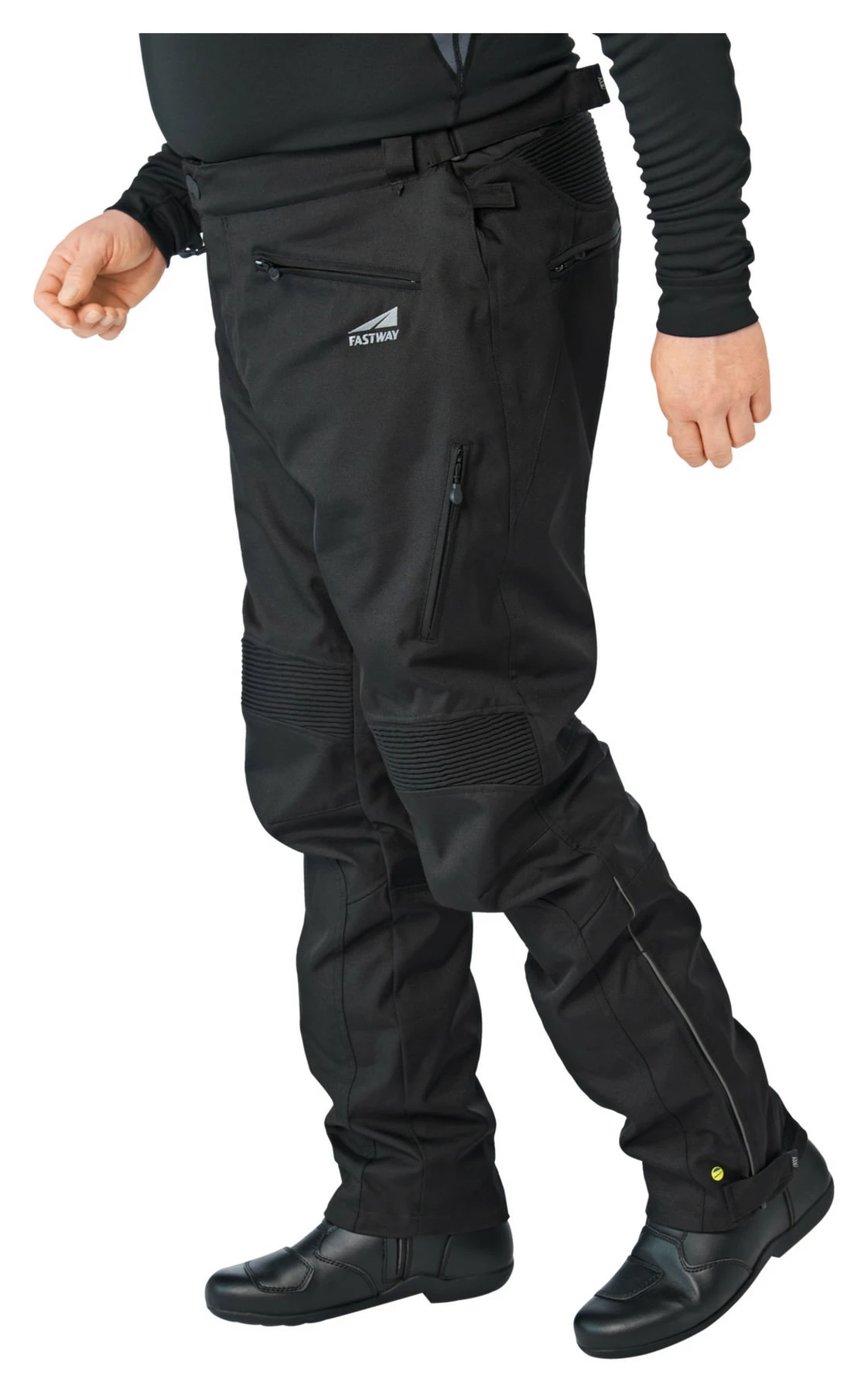 Close-fitting, sporty motorcycle trousers look good, of course. But when you’re touring and racking up the miles, the last thing you want is uncomfortable trousers that pinch or restrict your movements. Particularly if you’re a tall, well-built person, your touring clothes need to offer functionality, but above all they should be a comfortable fit and have some stretch. They should give with your movements on your motorcycle, and not restrict you at all. Like Fastway *Touring Men 201* Textile Trousers. With multiple adjustment options. Made for large sizes so that you can enjoy the ride.