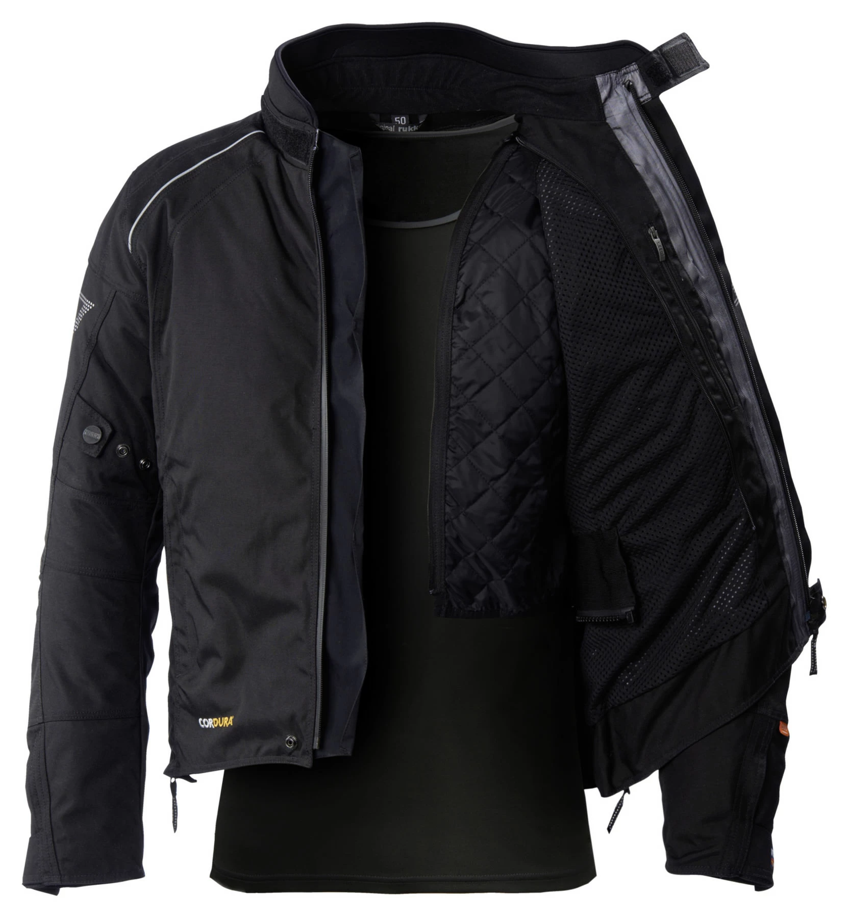 On a motorcycle tour, equipment parts need to practical, light and uncomplicated. Rukka had exactly these requirements in mind when it developed the *Herm* textile jacket. The result is a motorcycle touring jacket with Gore-Tex Z-Liner membrane you can wear all year round. Enjoy!